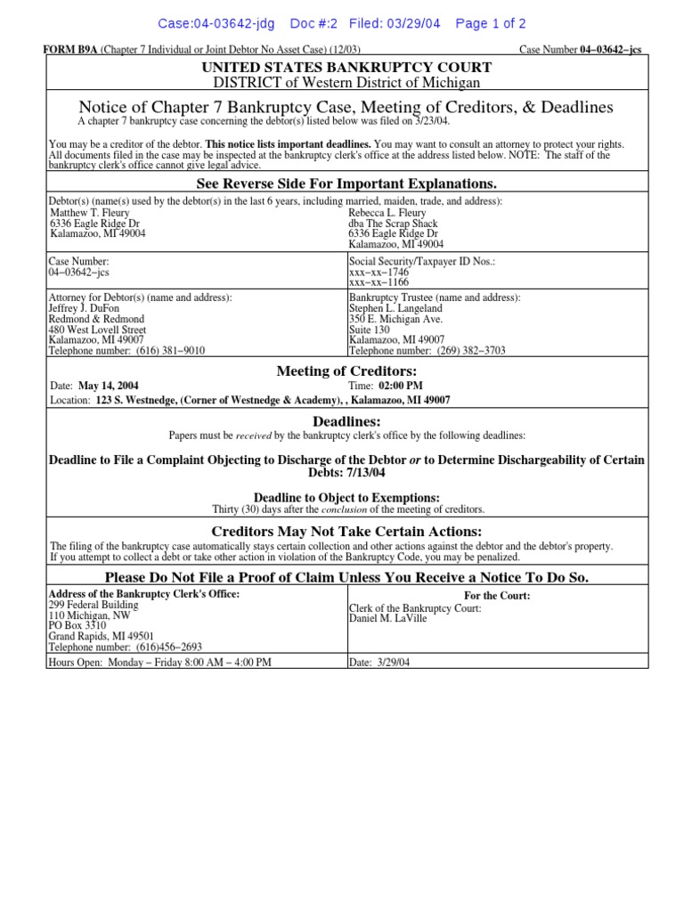 Notice of Chapter 7 Bankruptcy Case Meeting of Creditors Deadlines
