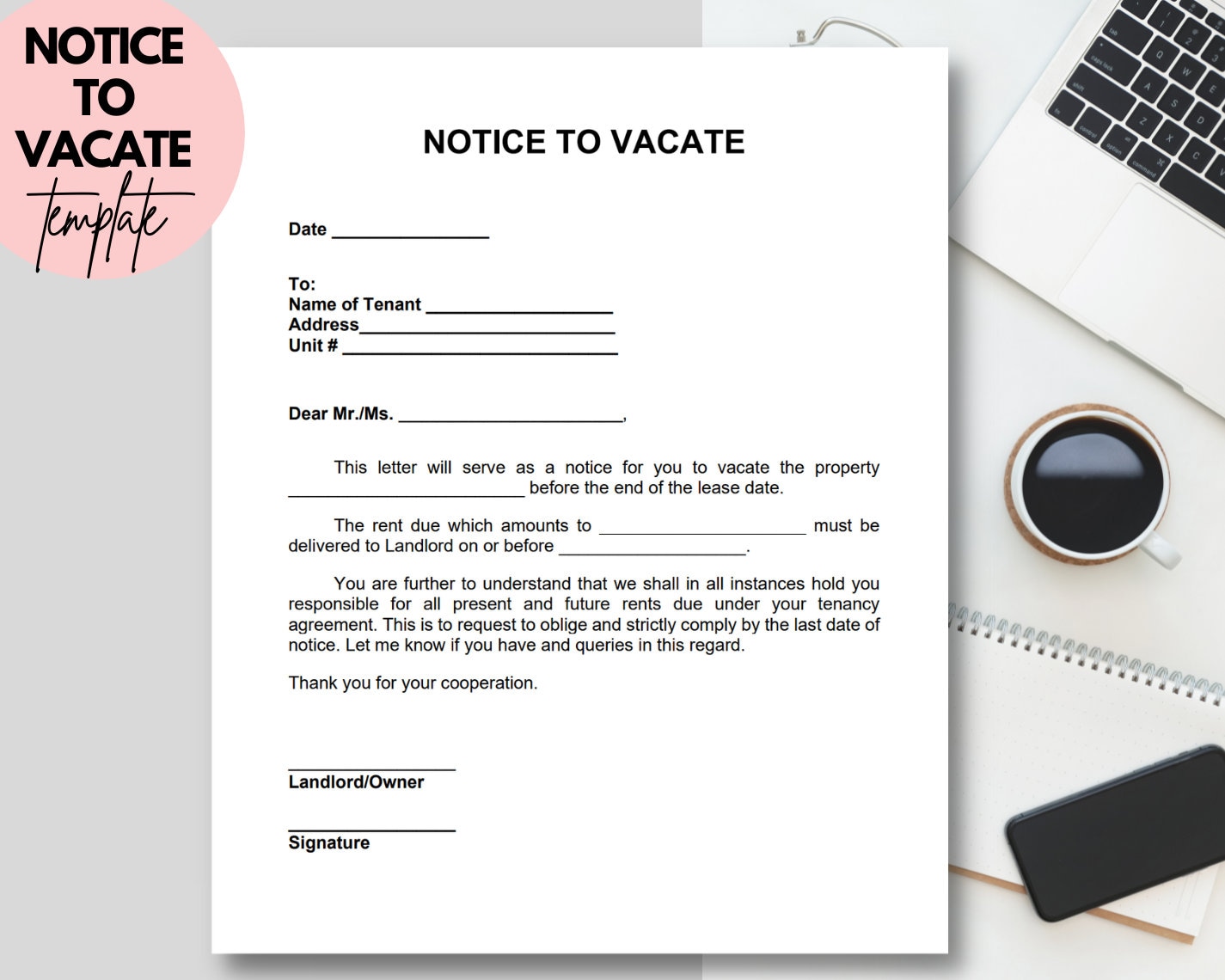 Editable Notice to Vacate Template PDF Word A4 US Letter Size