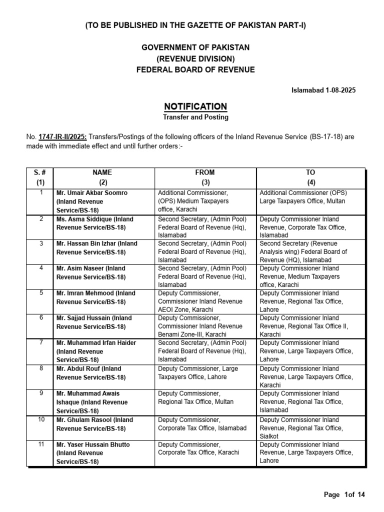 Notification No 1747 IR II 2025 Posting of IRS BS 17 18 PDF Karachi