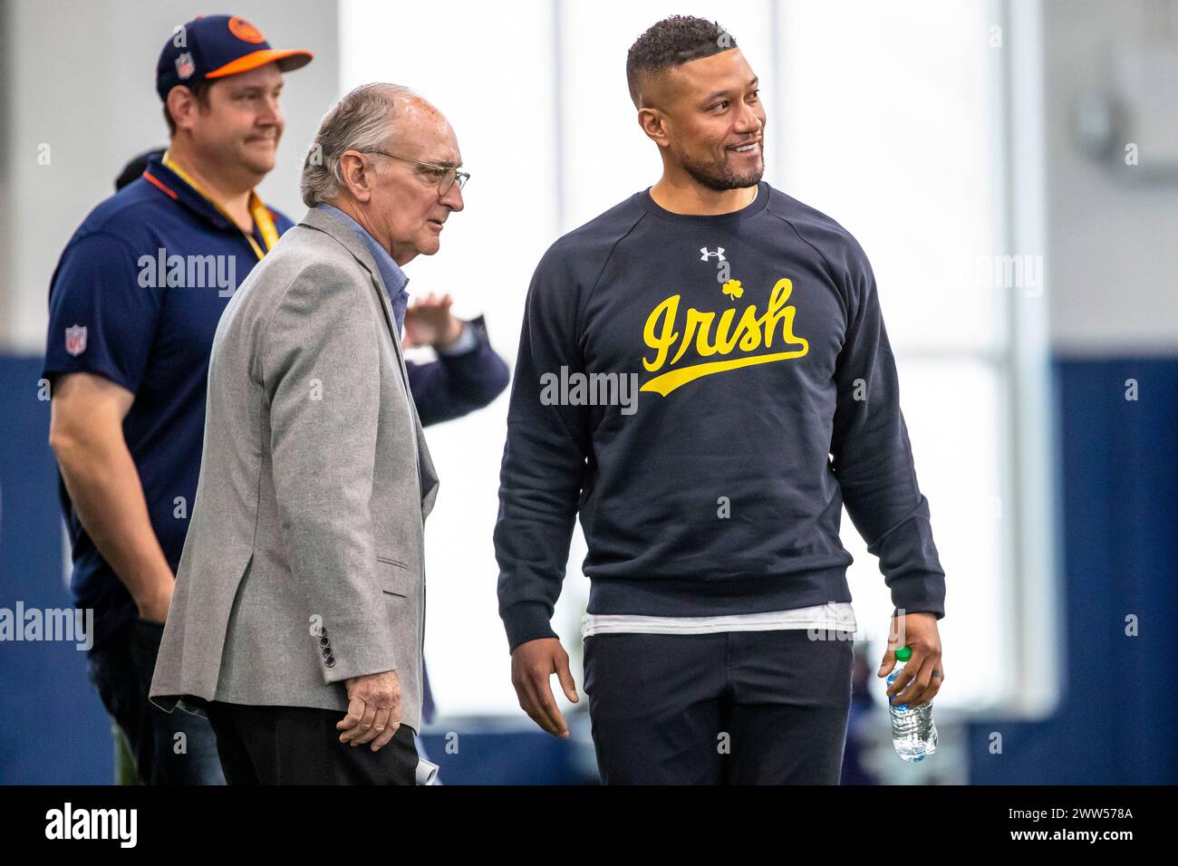 Notre Dame head coach Marcus Freeman right talks with current Notre