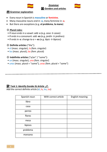 Spanish Grammar Genders and Articles KS3 Worksheet Teacher