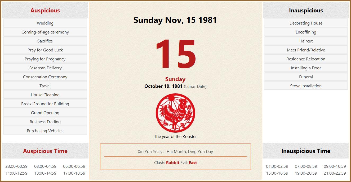 November 15 1981 Almanac Calendar: Auspicious/Inauspicious Events and