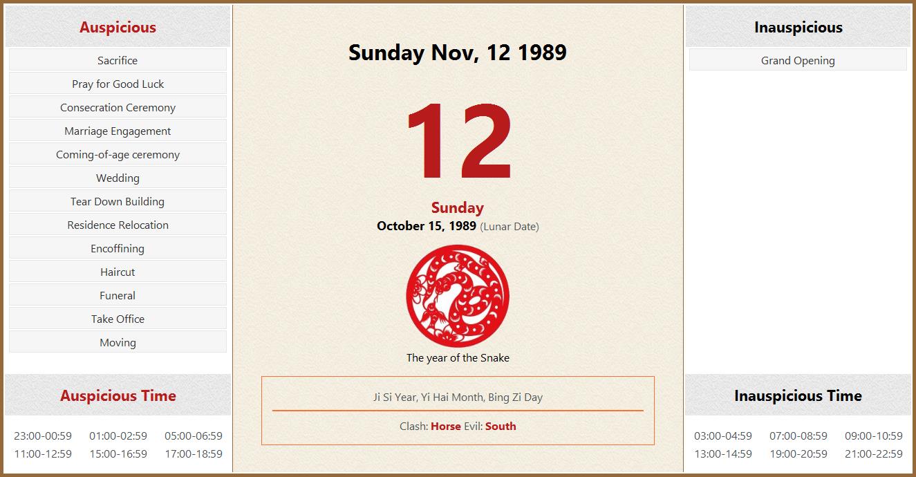 November 12 1989 Almanac Calendar: Auspicious/Inauspicious Events and