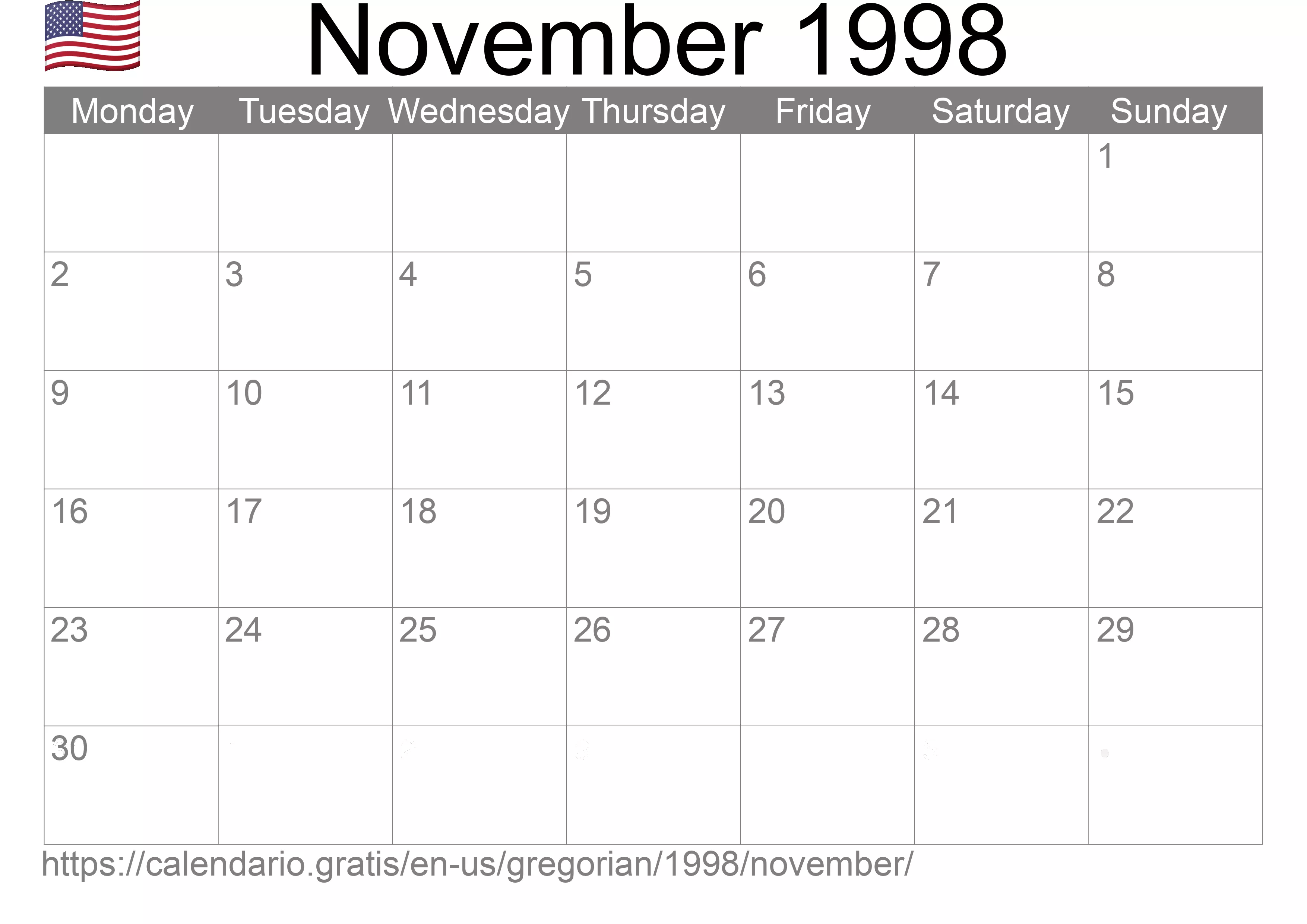 Calendar November 1998 from United States of America in English