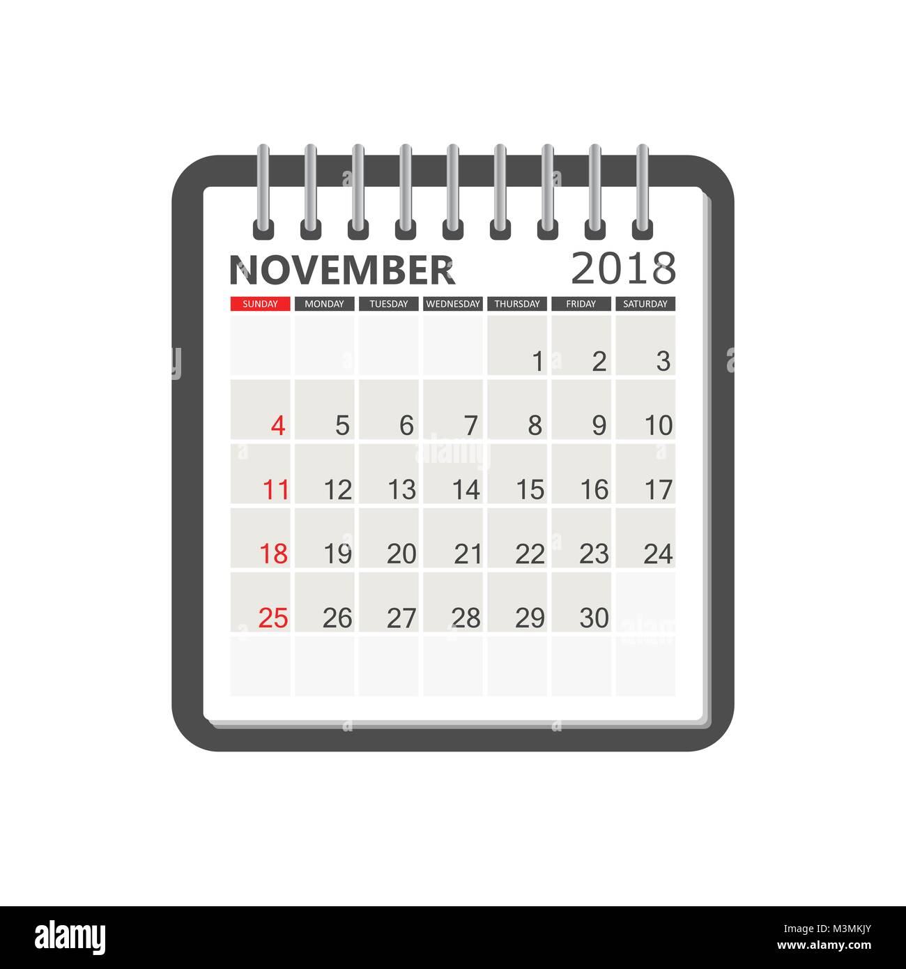 3d illustration of november 2018 calendar isolated over white