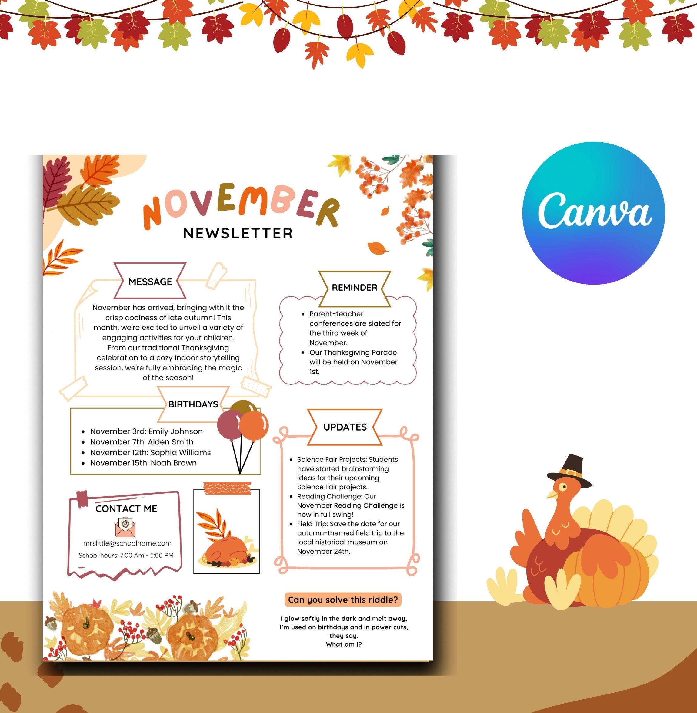Canva November Newsletter Template/ Editable Newsletter Template