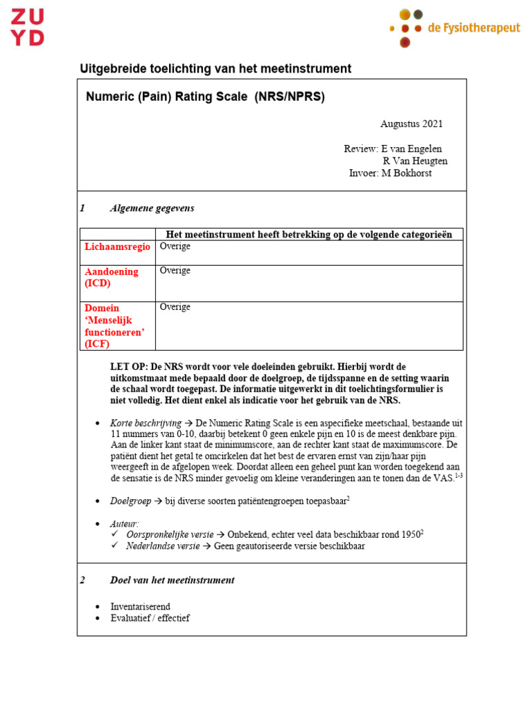 Numeric Rating Scale (NPRS) Uitgebreide uitleg PDF materiaal