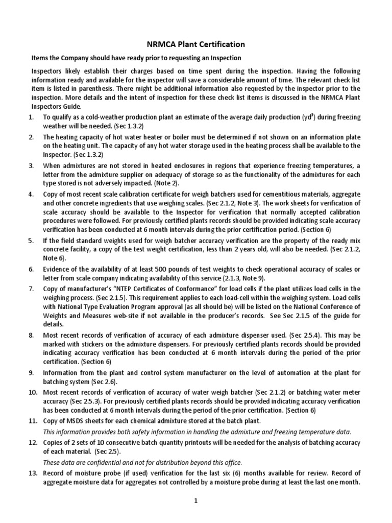 NRMCA Plant Certification: Items The Company Should Have Ready Prior To