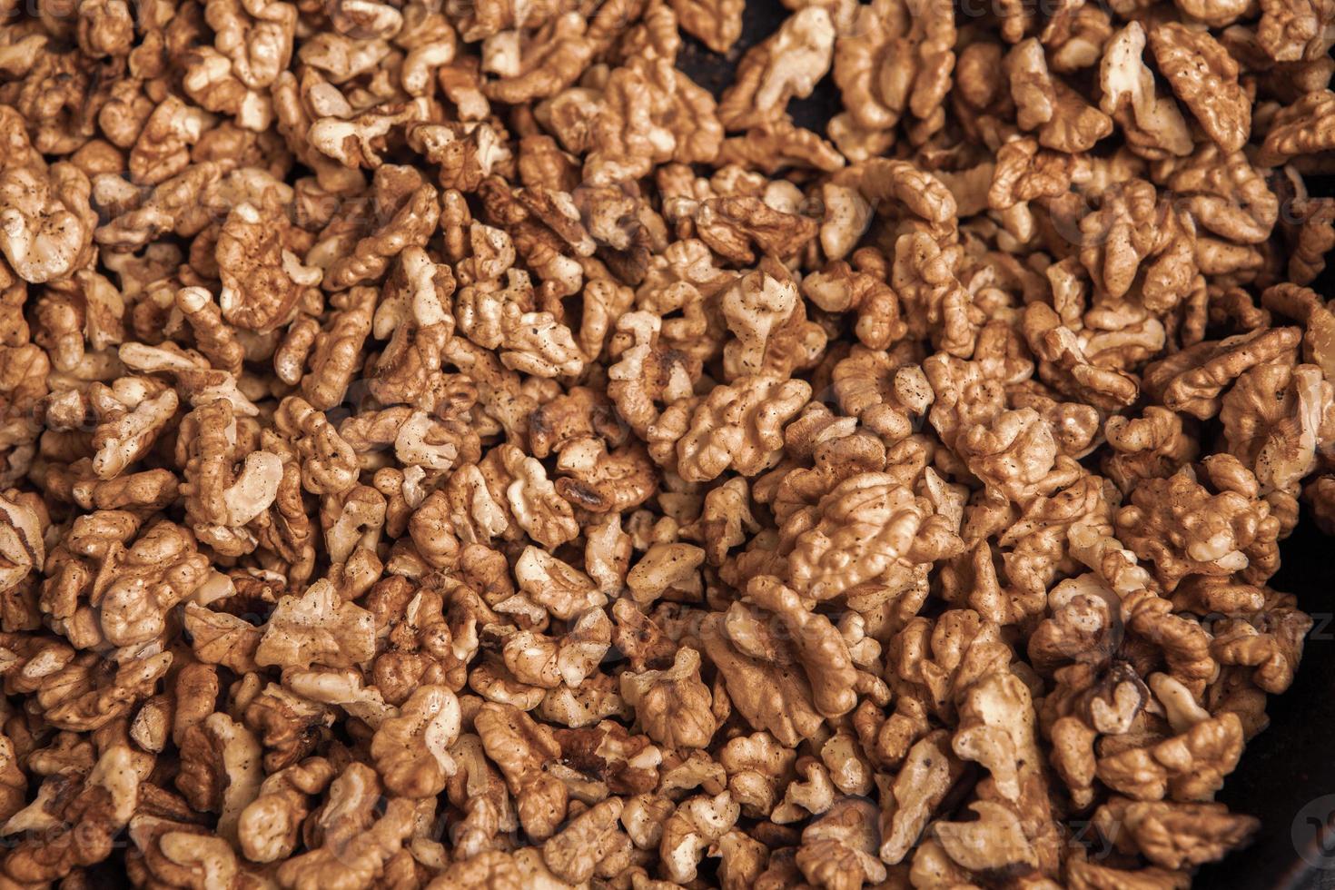 fondo de nuez nueces peladas en una placa de hierro en negro nueces