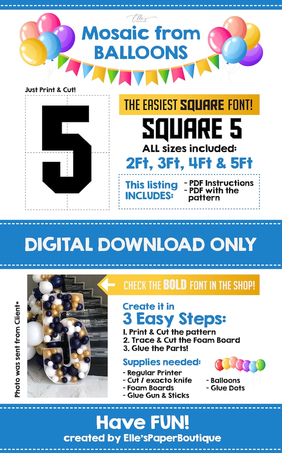 SQUARE Number 5 Balloon Mosaic Template 2ft 3ft 4ft 5ft Kawaii Raymi