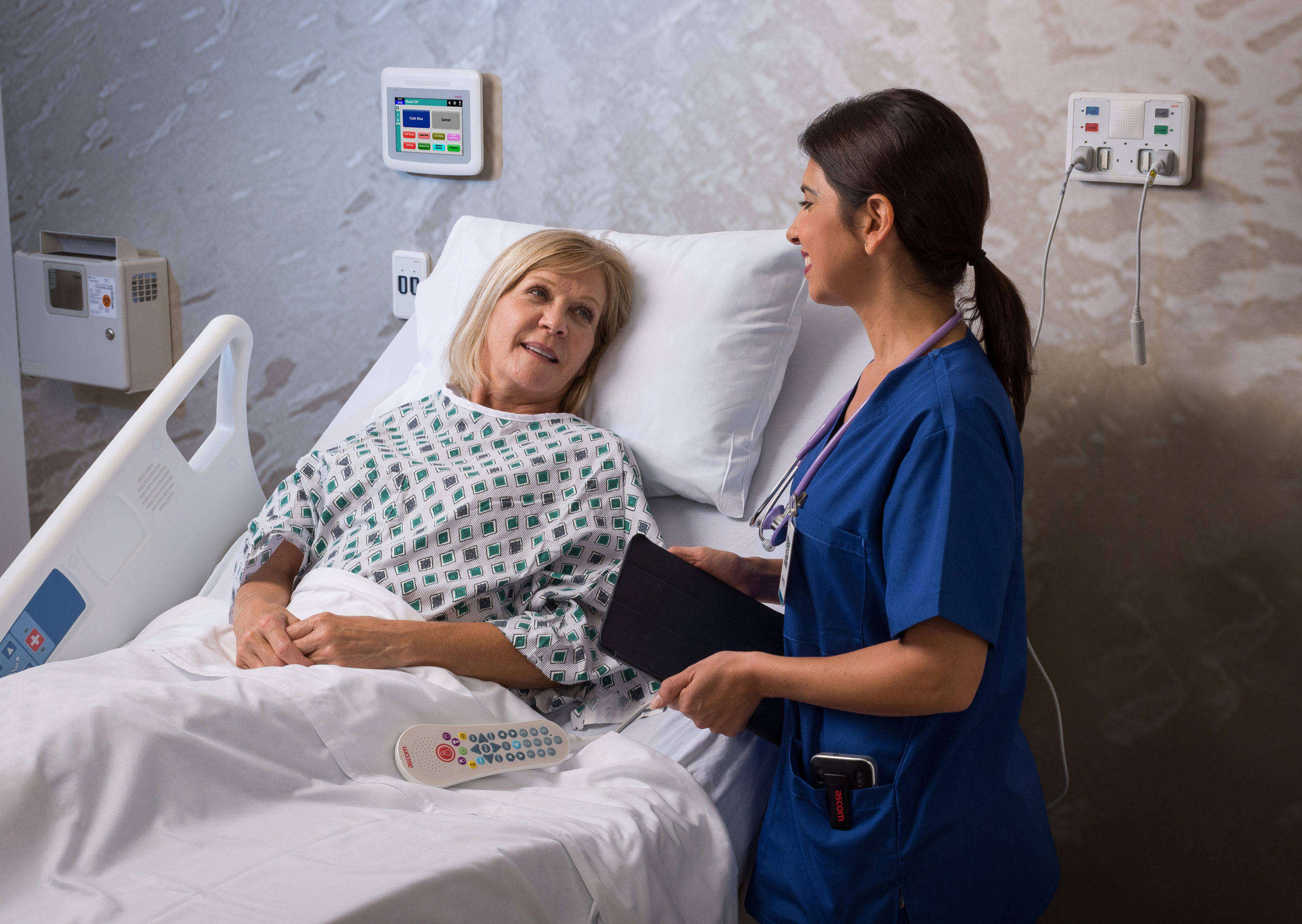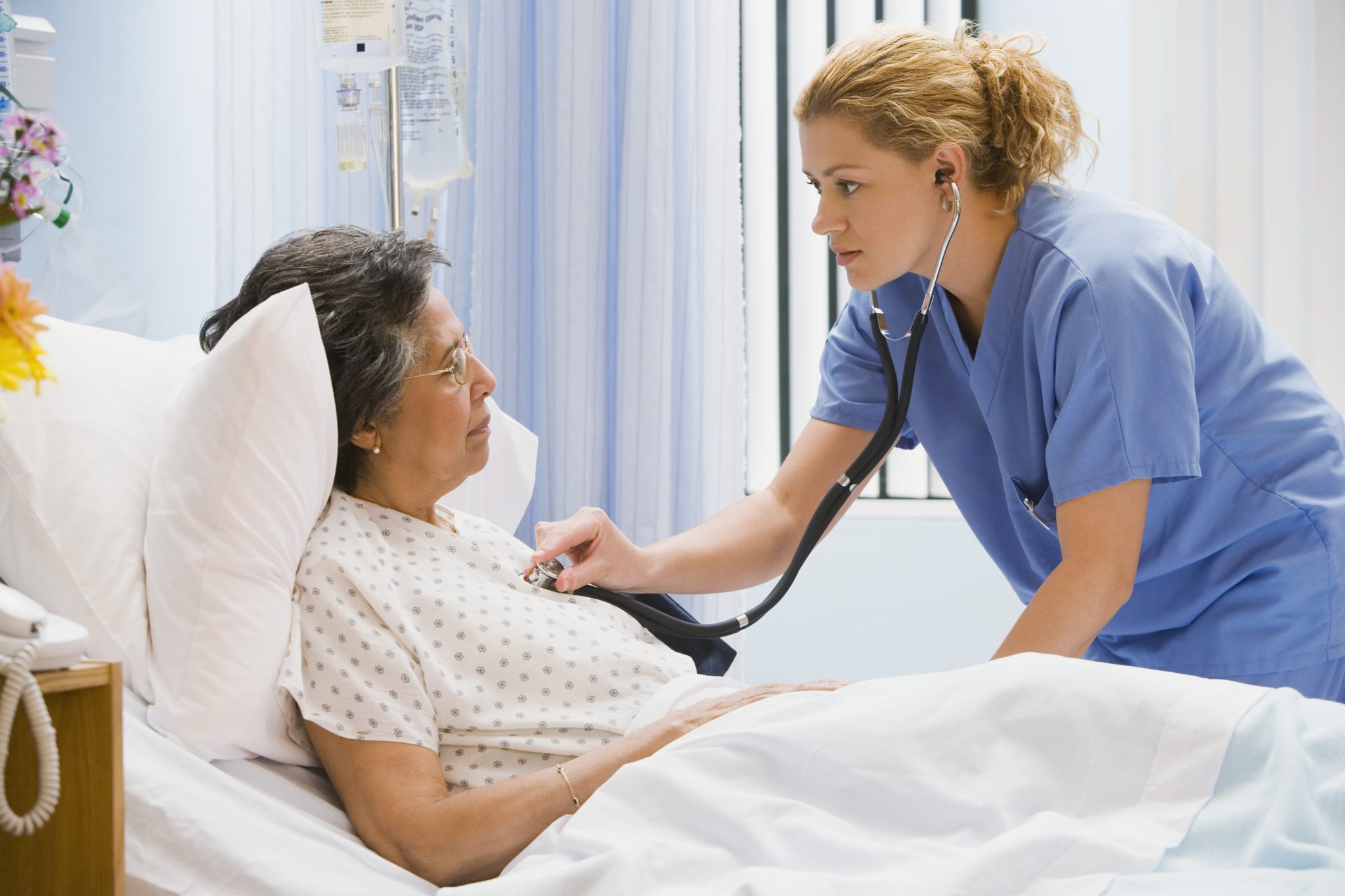 A nurse is standing next to an elderly woman in a hospital bed