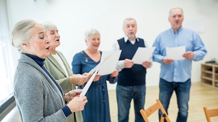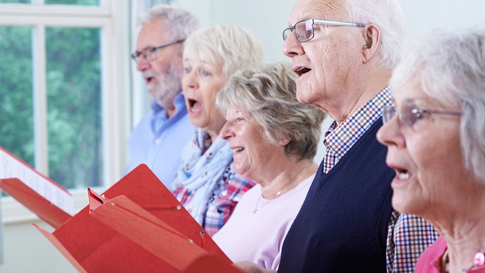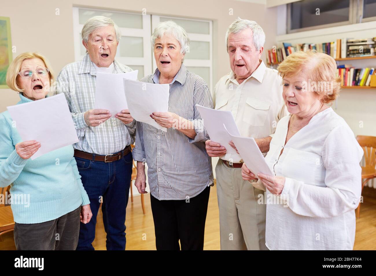 Senior Choir Sings at Choir Rehearsal in Retirement Home Stock Photo