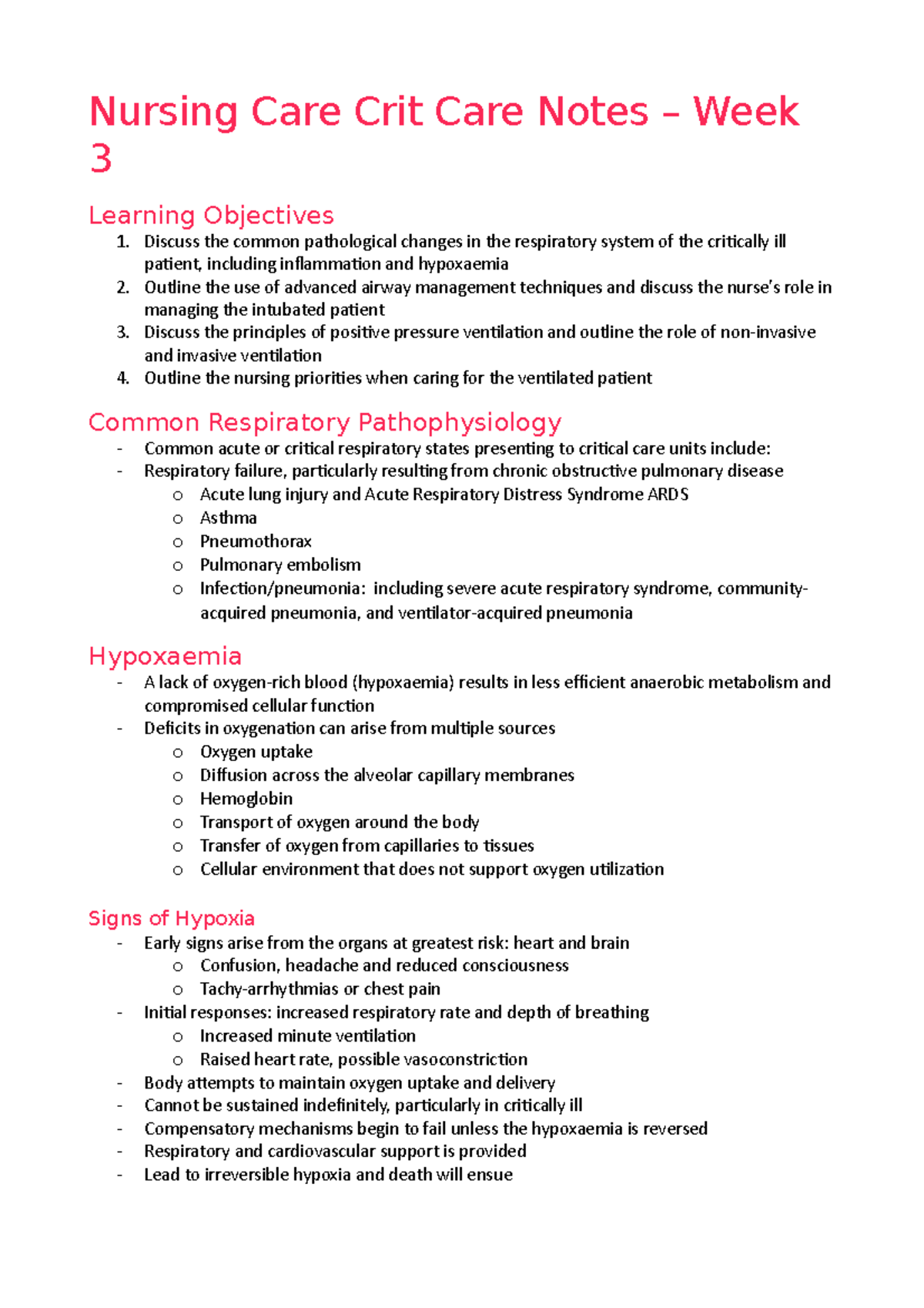 Nursing Care Crit Care Notes Week 3 Nursing Care Crit Care Notes