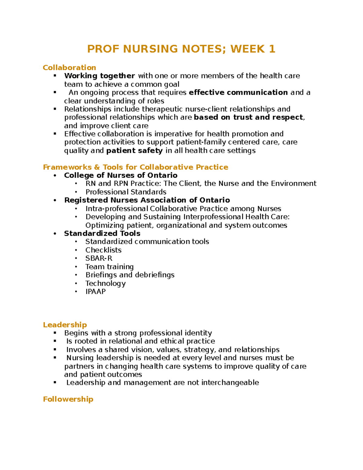 Week 1 notes PROF NURSING NOTES WEEK 1 Collaboration § Working