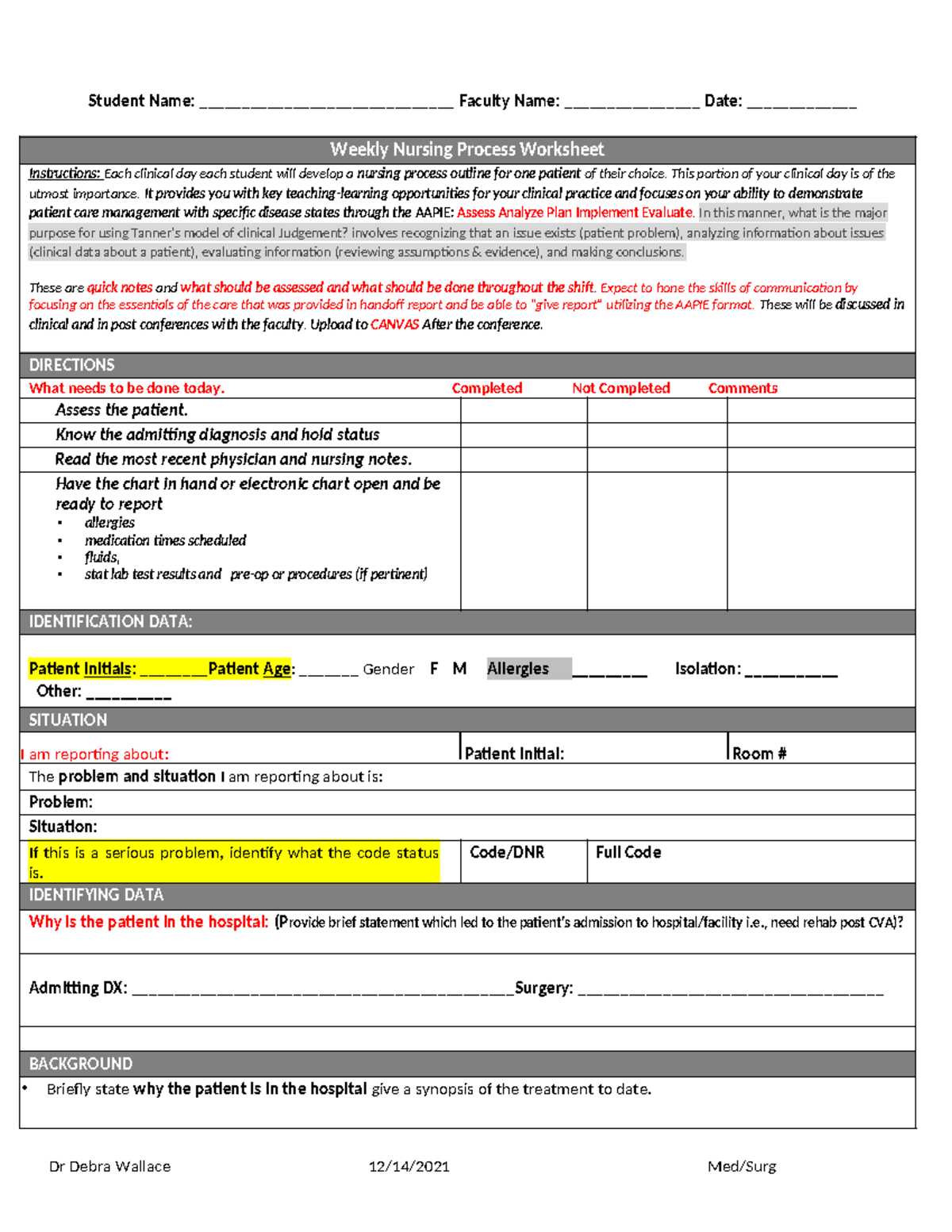 WCU Weekly Nursing Process Worksheet for Clinical Practice Studocu