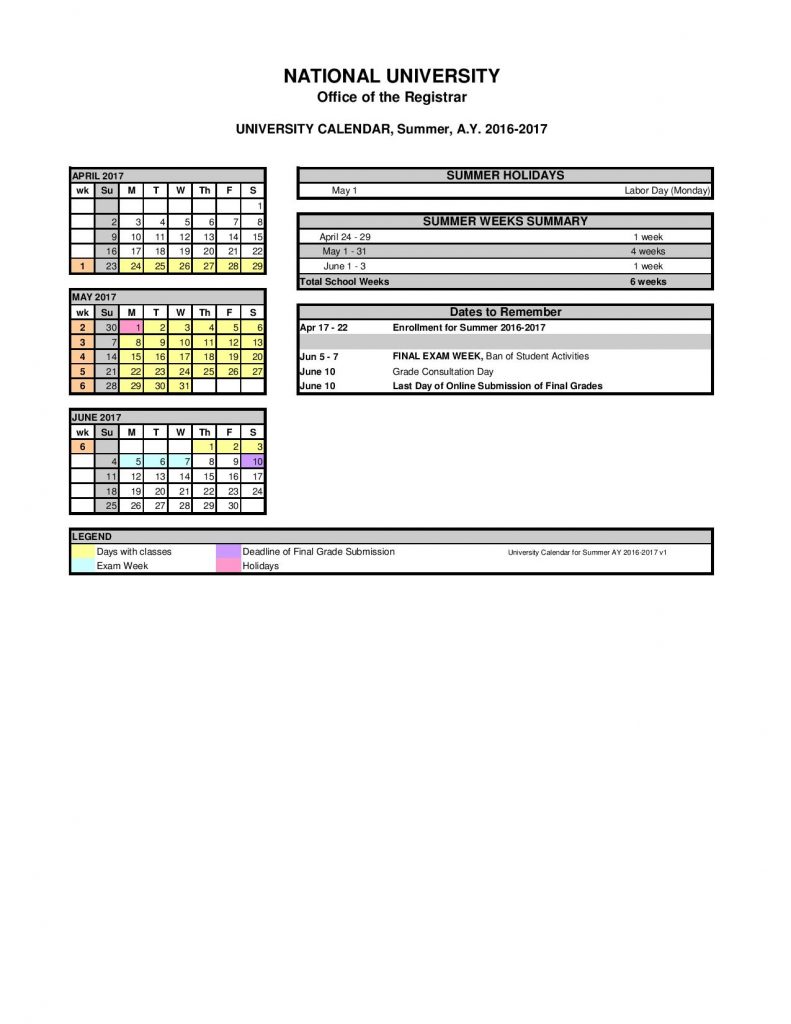 NU University Semestral Calendar Summer AY2016 2017 v1 National