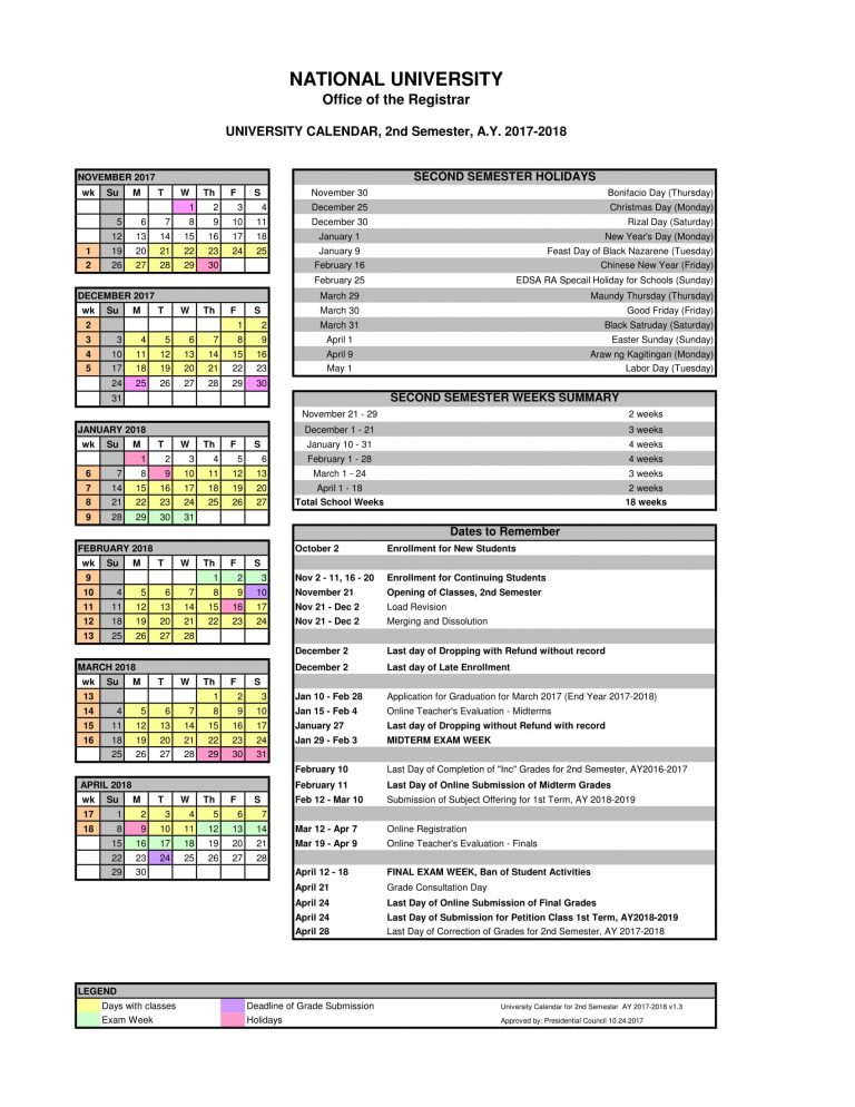 NU University Semestral Calendar Semester2 AY2017 2018 v1 3 1