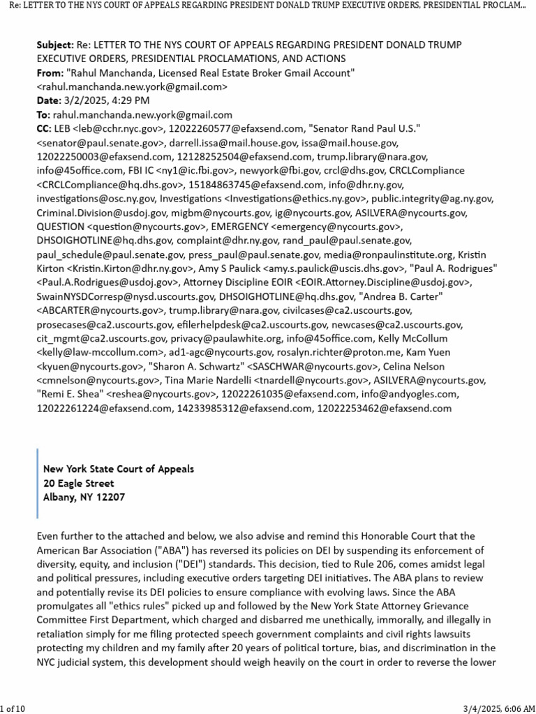 Letter To The NYS Court of Appeals Regarding President Donald Trump