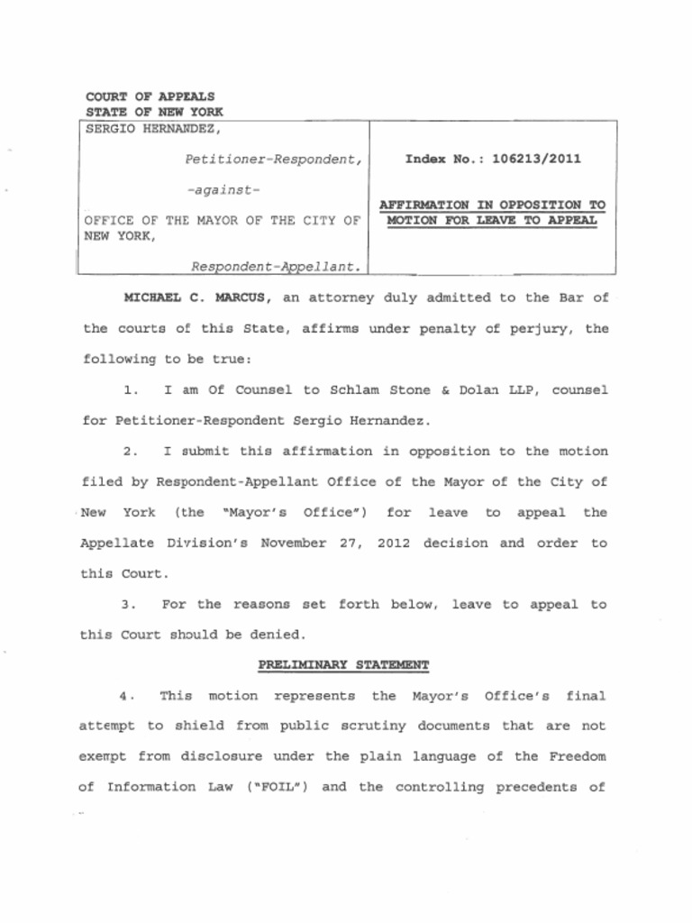 Affirmation in Opposition To Motion For Leave To Appeal To NYS Court of