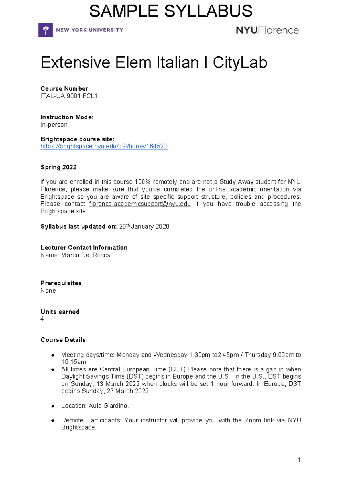 Syllabus NYU Florence ITAL UA 9001 FCL1 Elementary Italian 1 City Lab