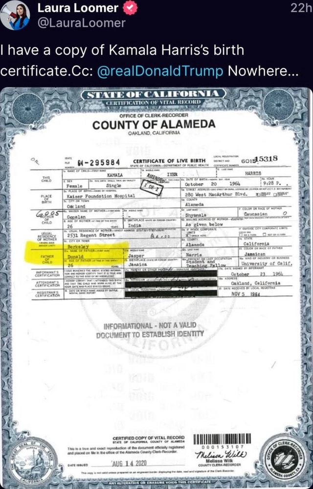 Laura Loomer uraLoomer I have a copy of Kamala Harris #39 s birth