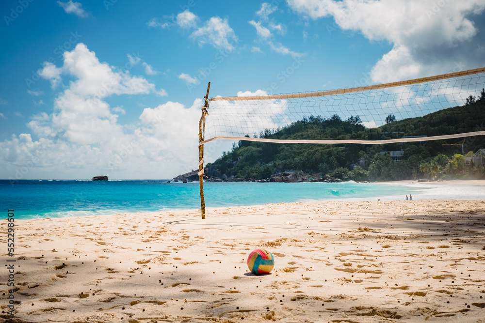 Volleyball net on tropical beach with blue sky Beach volleyball court