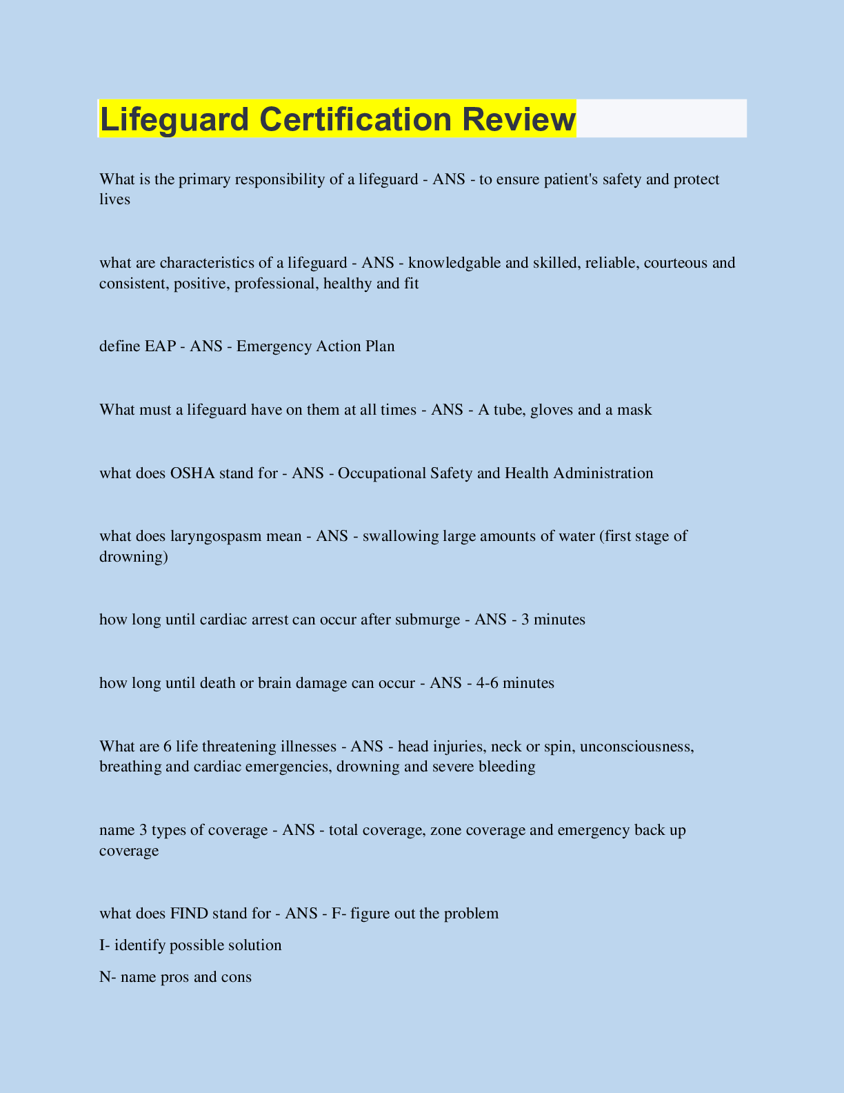 Lifeguard Certification Review 50 Questions with 100% Correct Answers