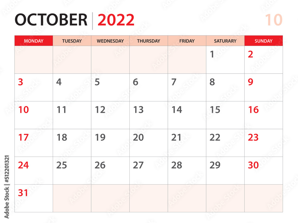 October 2022 template Calendar planner 2022 week start on Monday