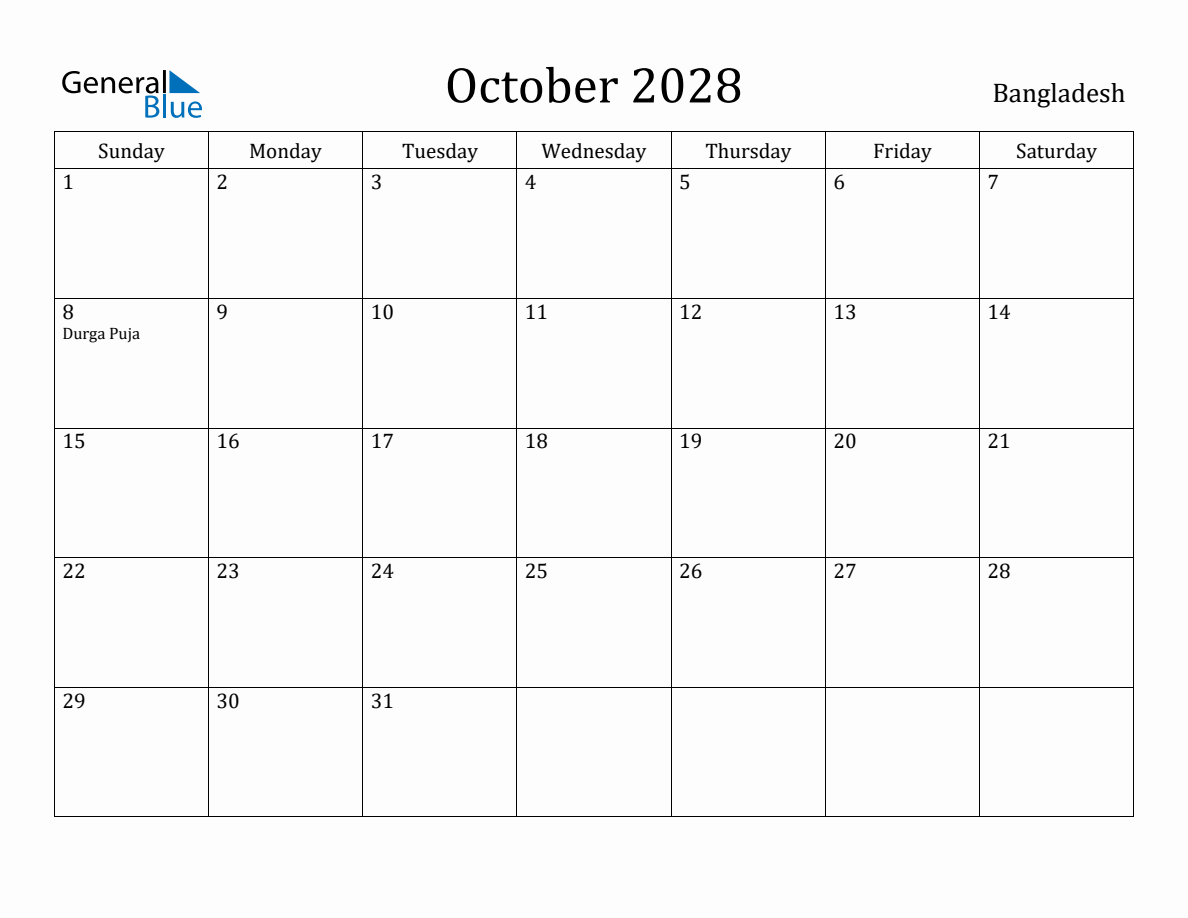 October 2028 Monthly Calendar with Bangladesh Holidays