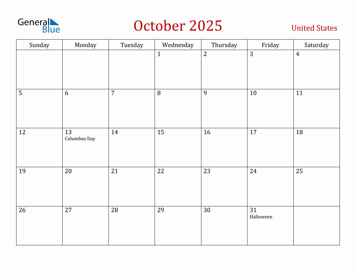 October 2025 United States Monthly Calendar with Holidays