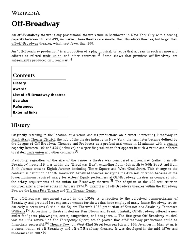 Off Broadway: History Awards List of Off Broadway Theatres See Also