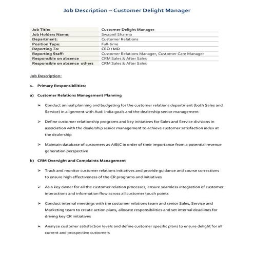 Job Description Customer Delight Process Manager PDF