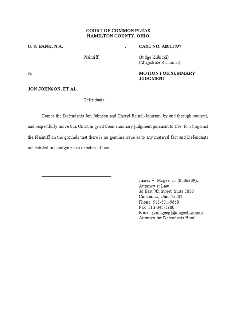 Court of Common Pleas Hamilton County Ohio U S Bank N A CASE NO