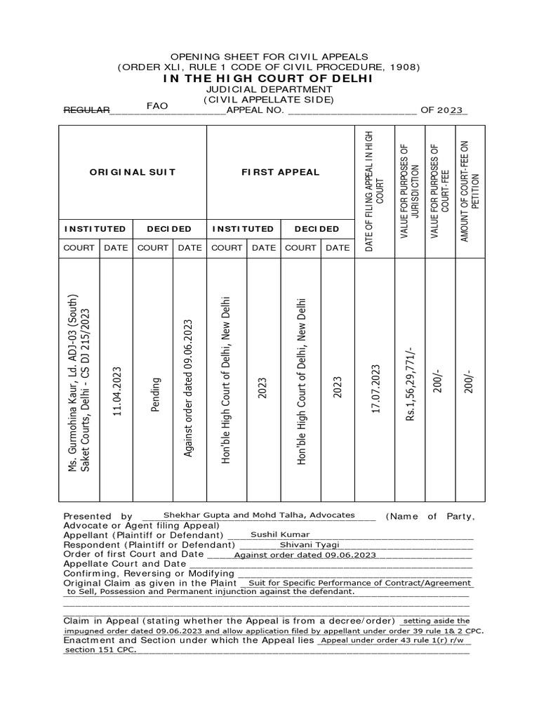 Opening Sheet For Civil Appeals PDF Lawsuit Appeal