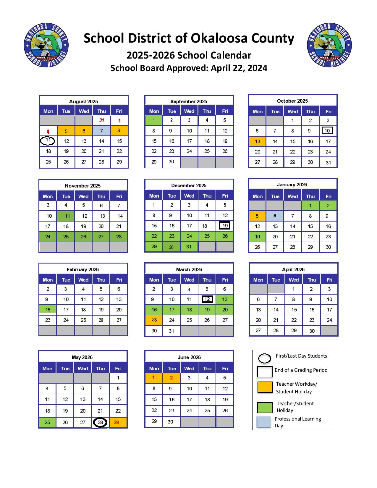Okaloosa County School Calendar 2025 2026 Academic Holiday