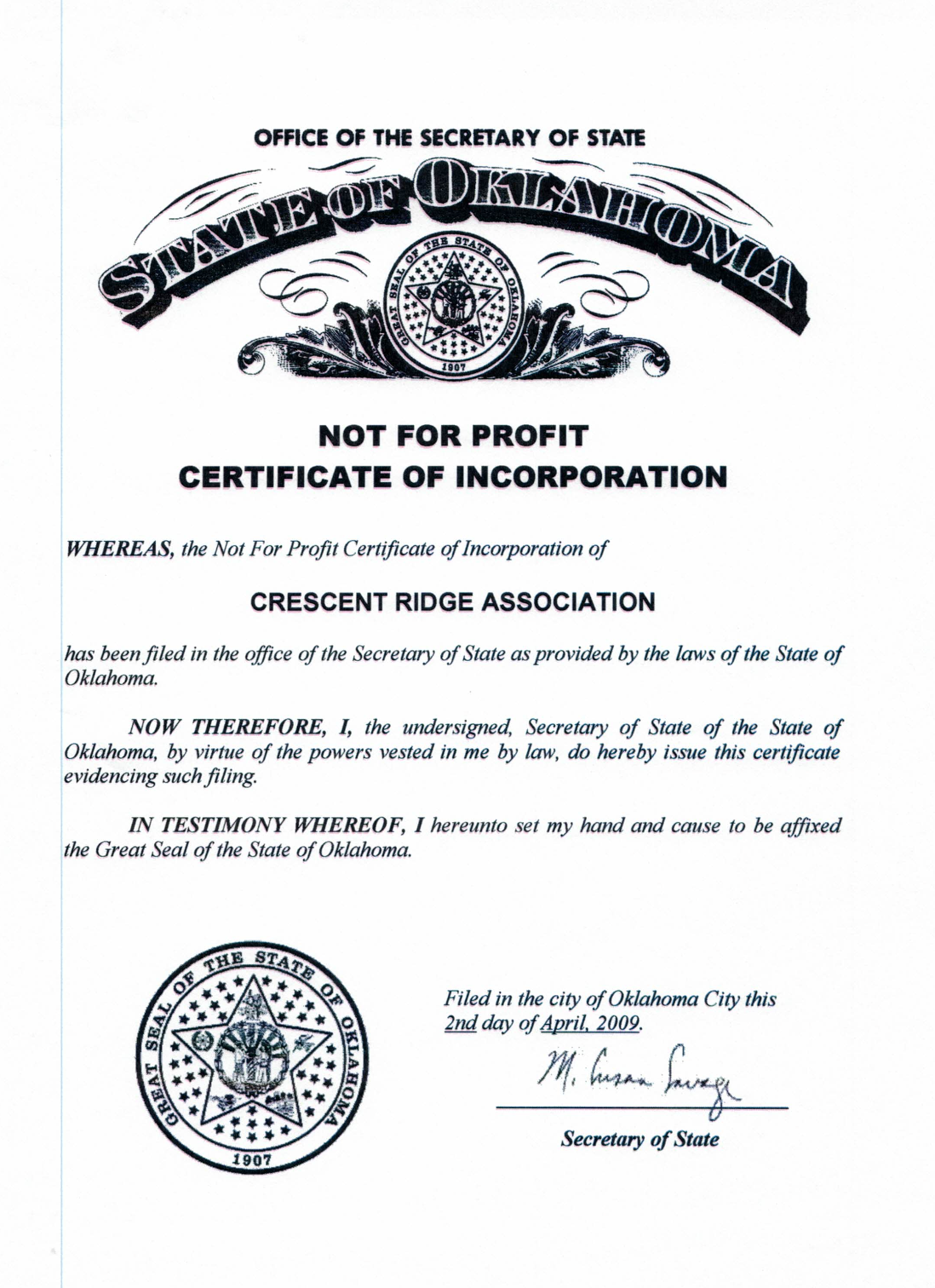 Certificate of Incorporation Proudly located in Owasso Oklahoma