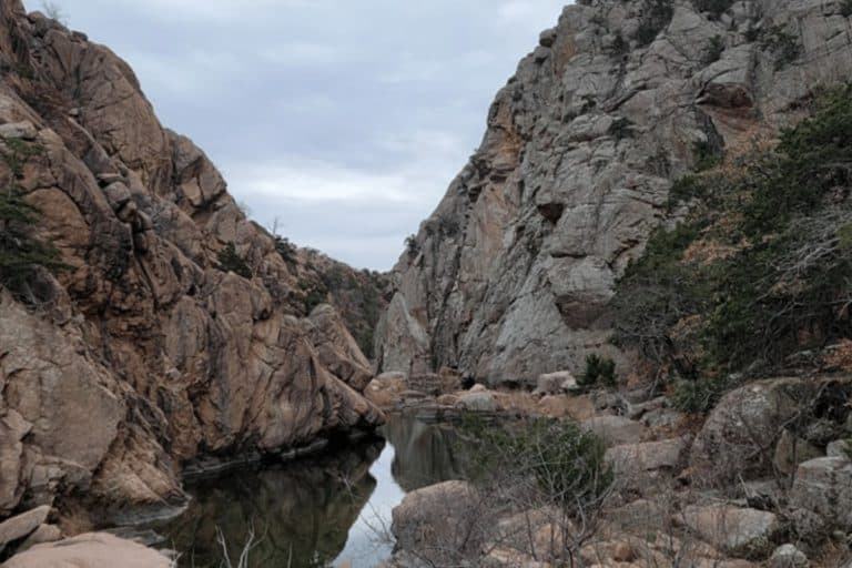 Sunny view of hiking in the Narrows Trail of Wichita Mountains National