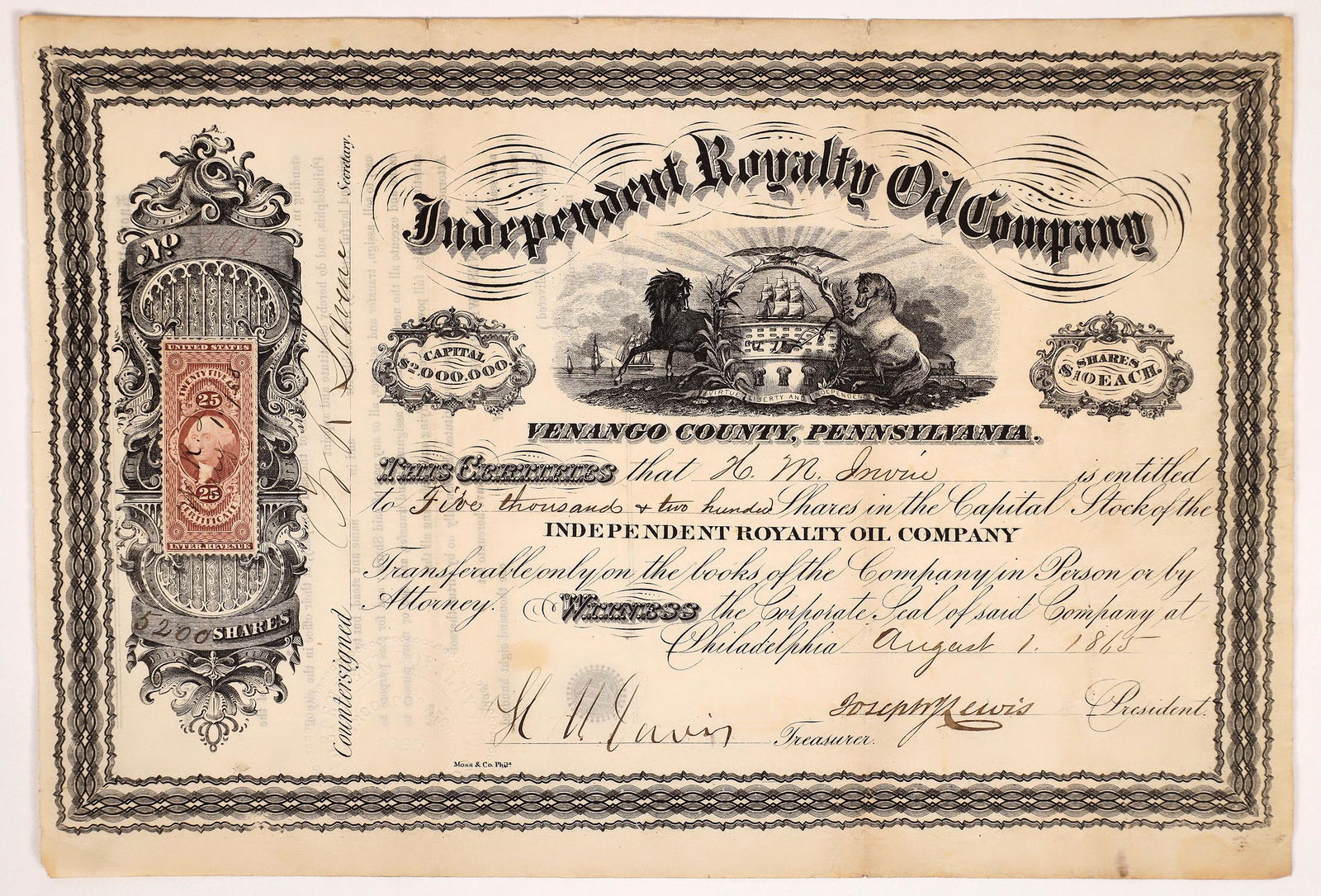 Pennsylvania and Ohio Oil Company stock certificate 1865 (Pennsylvania)