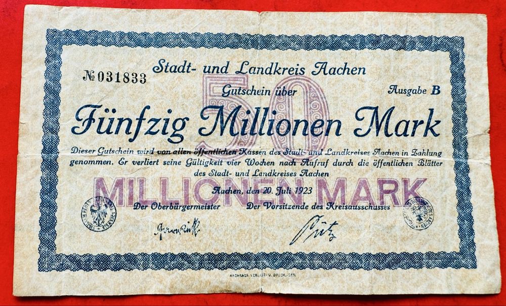 50 Millionen Mark 1923 Aachen Rarität Top Zustand (Gebraucht) in