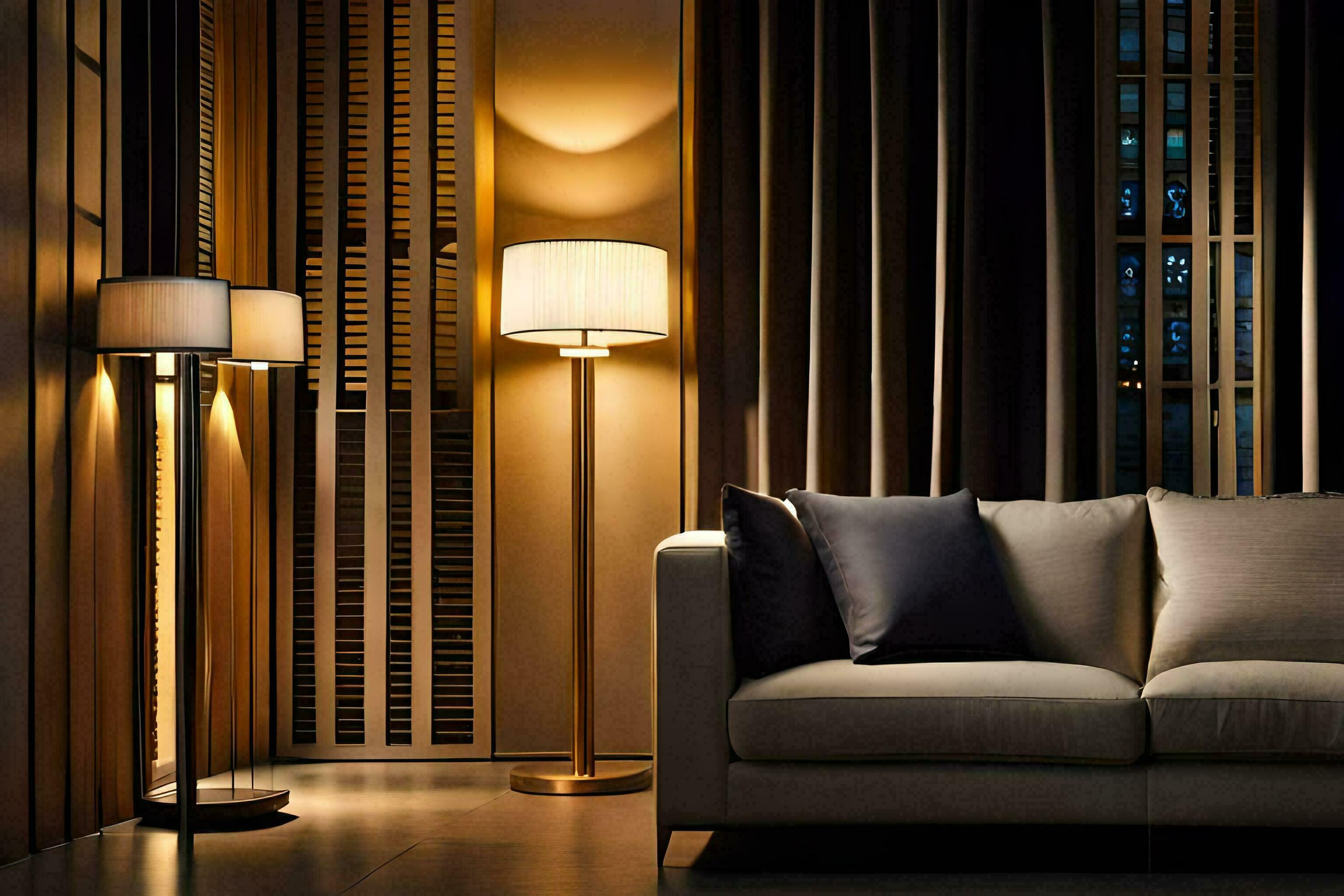 a modern living room with a couch and lamp AI Generated 30295390 Stock