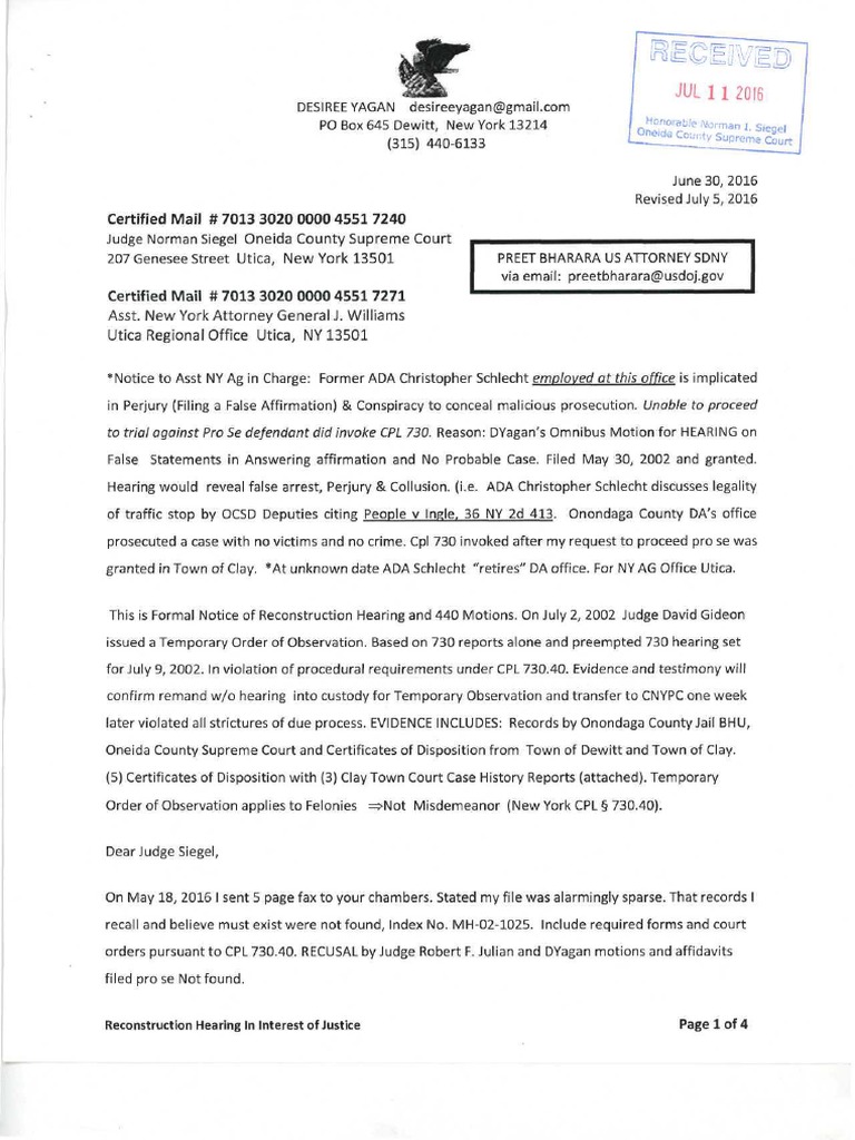 To Judge Siegel Oneida County Supreme Court (2016) CC Bharara US