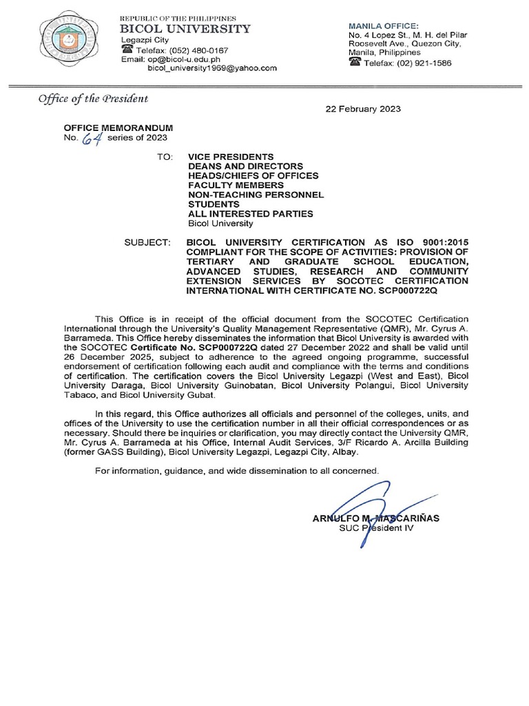 BU OP OM No 64 s 2023 re BU Certification as ISO 9001 2015 Compliant