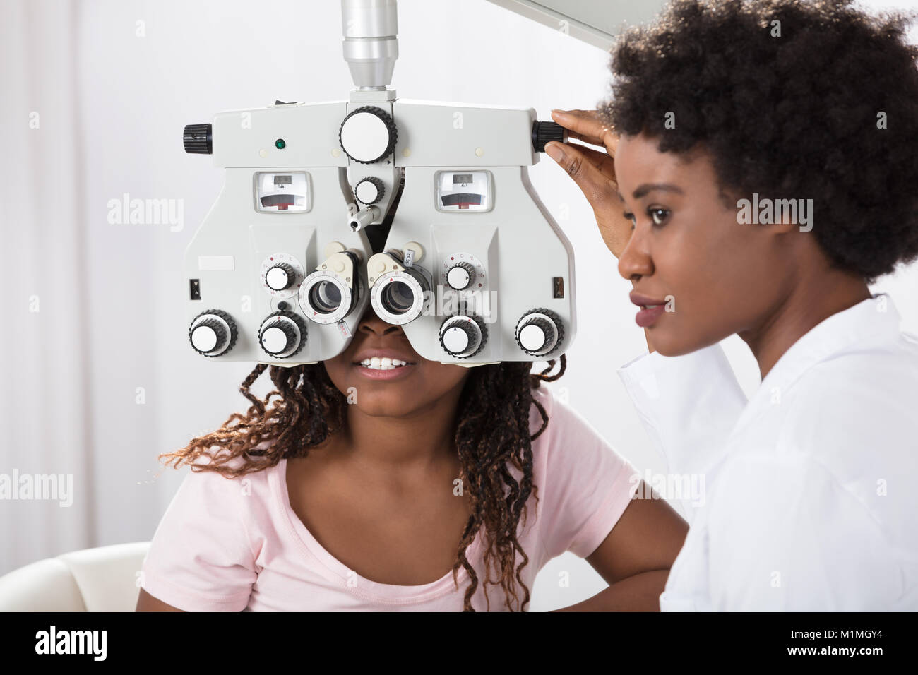 Optician Doing Optometry Eye Exam for Black African Teen Girl Patient