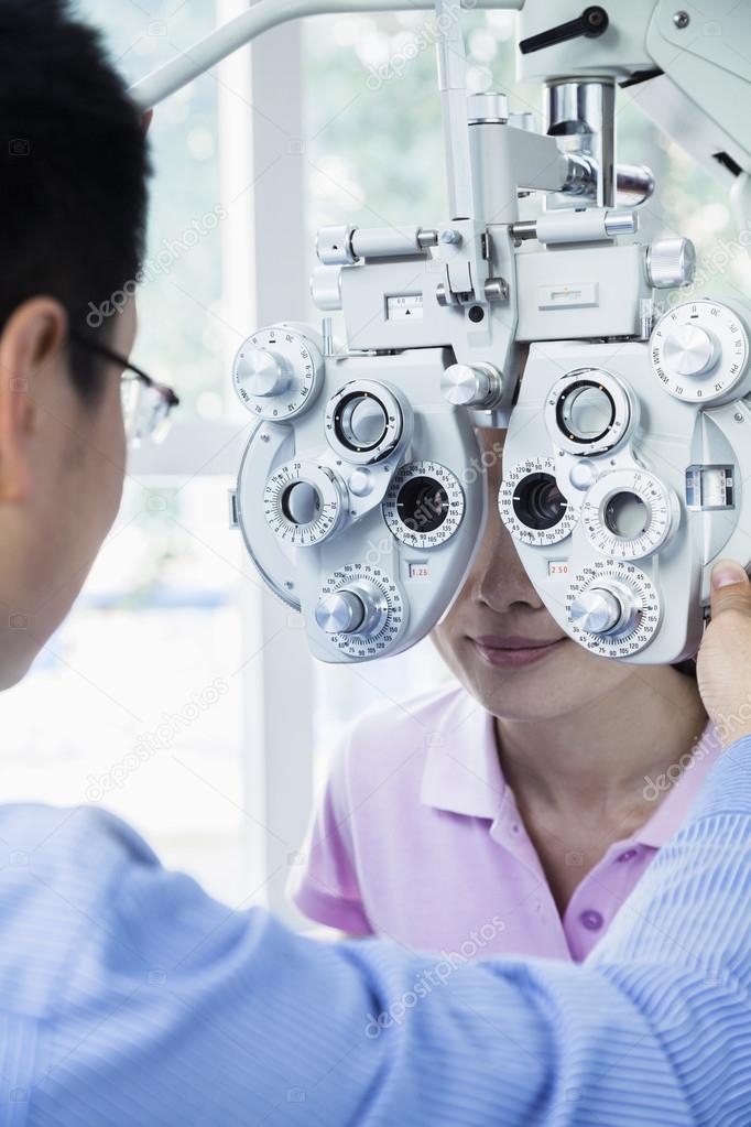 Optometrist doing an eye exam on young woman Stock Photo © XiXinXing