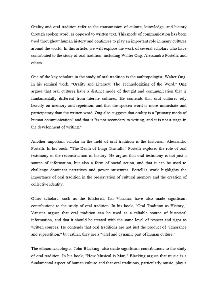Orality and Oral Tradition Refer To The Transmission of Culture PDF
