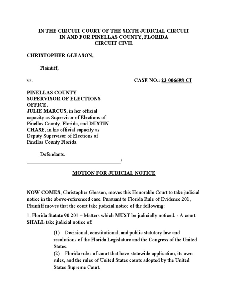 Pinellas County Motion For Judicial Notice Gleason Vs Pinellas County
