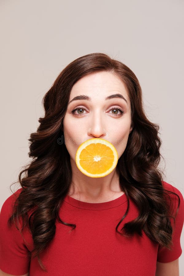 Portrait of Brunette with Orange Covering Mouth Stock Image Image of