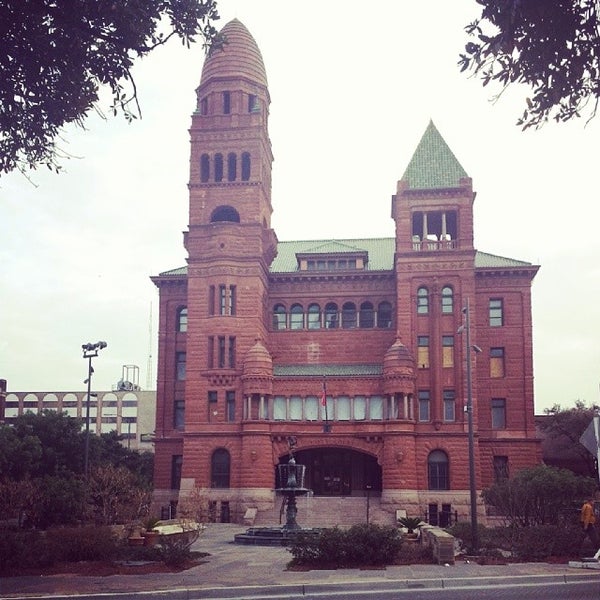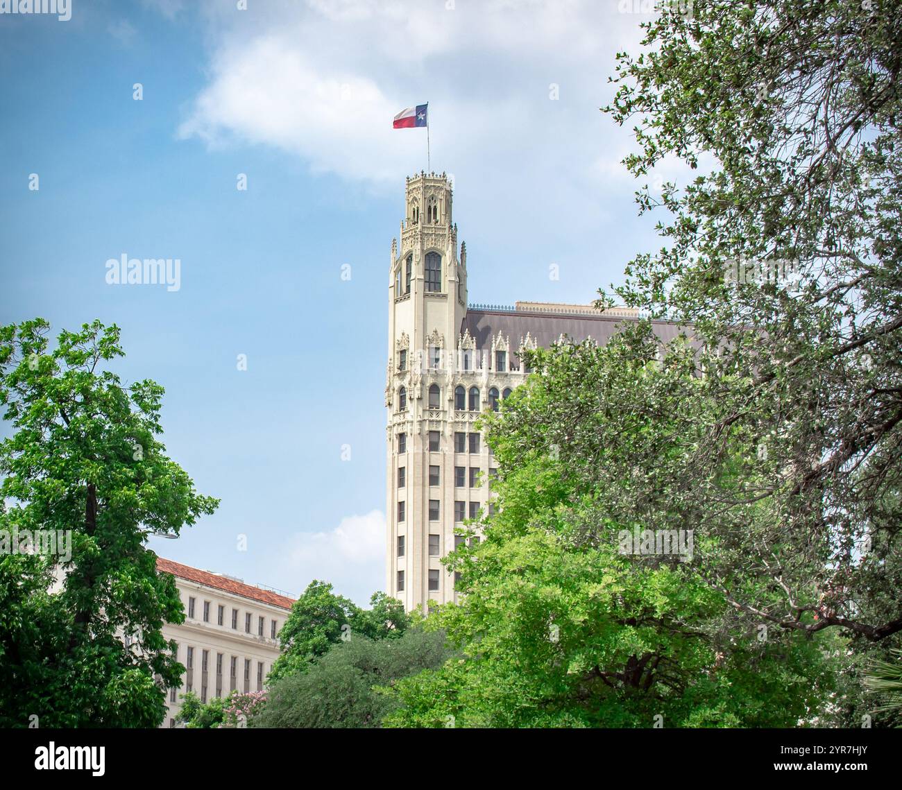 San Antonio Court Building with Texas flag surrounded by trees Stock