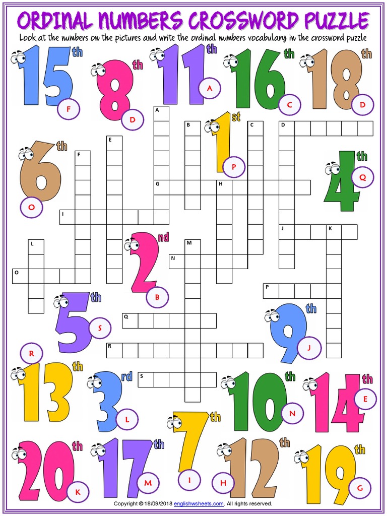 Ordinal Numbers Crossword Worksheet Download Print Now