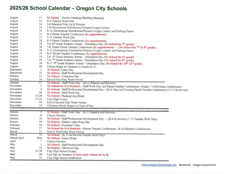 Oregon City Schools Calendar
